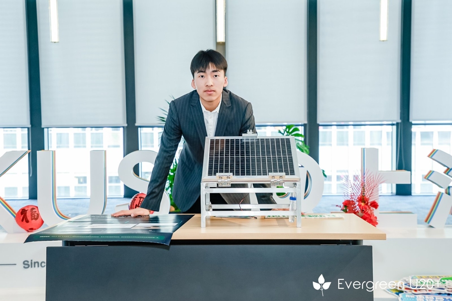 在众多项目中,上海包玉刚实验学校学生周天洋“基于光伏—MOF吸附的分布式水电联供系统”成为现场焦点。项目通过将光伏发电系统与MOF(金属有机框架)空气制水技术相结合,设计出一种仿生“呼吸”结构:白天利用光伏发电产生的余热驱动MOF材料释放水分,夜间通过自然降温实现水蒸气冷凝收集,实现光伏发电、降温与制水协同运行。